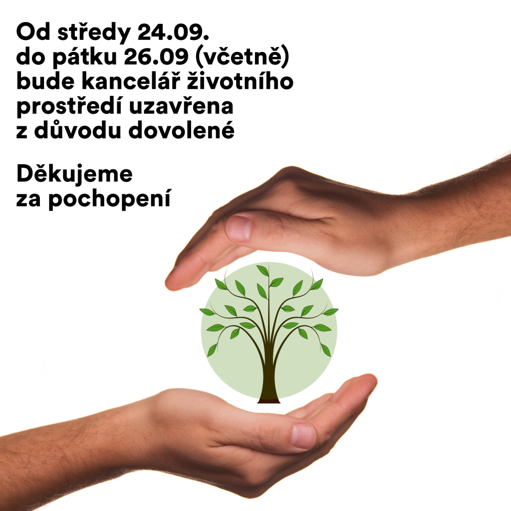 Z důvodu čerpání řádné dovolené kancelář životního prostředí v době od 24.09.2025 do 26.09.2025 uzavřena. Děkujeme za pochopení.