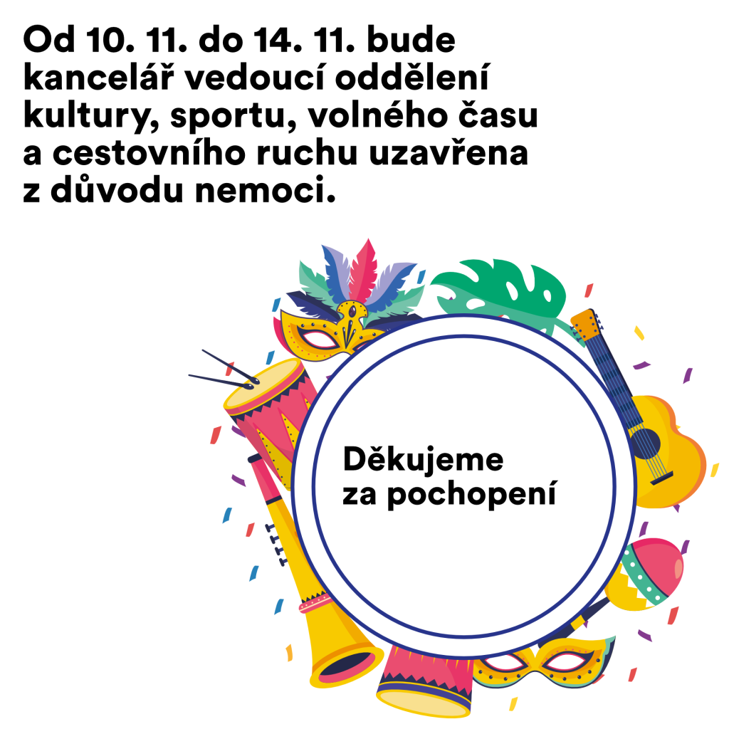 Od 10. 11. do 14. 11. bude kancelář vedoucí oddělení kultury, sportu, volného času a cestovního ruchu uzavřena z důvodu nemoci